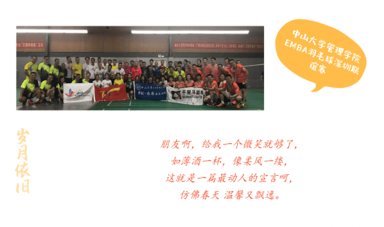 2018年7月7日中山大學(xué)EMBA羽毛球協(xié)會(huì)深圳聯(lián)誼賽在校友的支持下順利舉行,中山大學(xué)EMBA校友周秋瑾、李向東分別作為本次聯(lián)賽的主辦方和協(xié)辦方,作為主辦方的周秋瑾為了聯(lián)誼賽付出了很多心血,也正由于他的辛苦付出,才使得本次比賽在友好和諧的氛圍中完美落幕。 以球會(huì)友,“羽”情相融,再敘同窗情。參加本次聯(lián)誼賽的有中山大學(xué)管理學(xué)院EMBA羽毛球協(xié)會(huì)主席林海麗,參加比賽的各隊(duì)隊(duì)長(zhǎng)均為中山大學(xué)管理學(xué)院EMBA校友,他們都是率領(lǐng)著自己的俱樂部親自上陣,參賽隊(duì)伍主要有廣州市V5羽毛球俱樂部(隊(duì)長(zhǎng)關(guān)山)、中山大學(xué)管理學(xué)院EMBA黃埔32期動(dòng)動(dòng)羽毛球俱樂部(隊(duì)長(zhǎng)梁允勝),深圳羽林軍羽毛球俱樂部(隊(duì)長(zhǎng)周秋瑾)、深圳千里馬羽毛球俱樂部(隊(duì)長(zhǎng)李向東)。 比賽中發(fā)揚(yáng)了“友誼第一、比賽第二”的體育精神,各位參賽校友走出校門,在社會(huì)上摸爬滾打,至今已有十幾載,歲月在各自的臉龐心間也已印刻出了不同的滄桑質(zhì)感,但只要走上賽場(chǎng),沉睡于靈魂中的熱血激情就被喚醒,臉上輕松的笑容、場(chǎng)上矯健的身姿,像極了十幾年前穿著校服的一張張青澀、純真的少年,尤其是中山大學(xué)管理學(xué)院EMBA黃埔32期動(dòng)動(dòng)隊(duì),一個(gè)班組成了一支實(shí)力不凡的10人隊(duì)伍,在比賽過程中團(tuán)結(jié)合作、默契配合,是“奮斗、愛、分享”精神最生動(dòng)的詮釋和體現(xiàn)。曾經(jīng)校友相聚于球場(chǎng),便將半世滄桑拋腦后,一朝何妨作水仙。 經(jīng)不住逝水流年,逃不過此間少年,各位校友歷盡浮世紅塵飄零半,歸來只得一生坦誠,飽經(jīng)世故氣猶全。同窗四載情深意,吾拾憶兮君未離,那些被時(shí)光偷走了的,也只是那把年少青澀的傘。 一朝同窗,一生校友,愿大雨澆不滅你的熱情;愿你在外漂泊半生,歸來依舊赤誠;一生很長(zhǎng),愿時(shí)光變緩,愿故人不散。既然許久不見,相聚甚短,那我們就約好:下次球場(chǎng),再見!