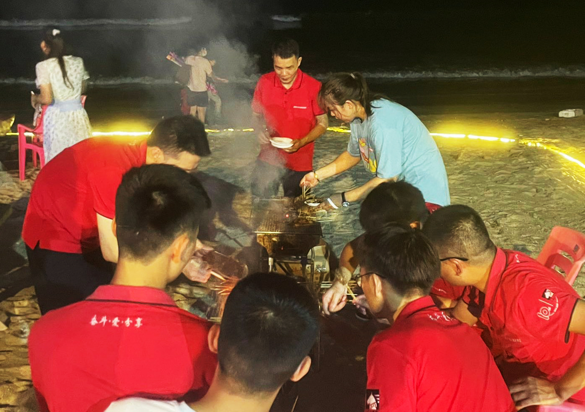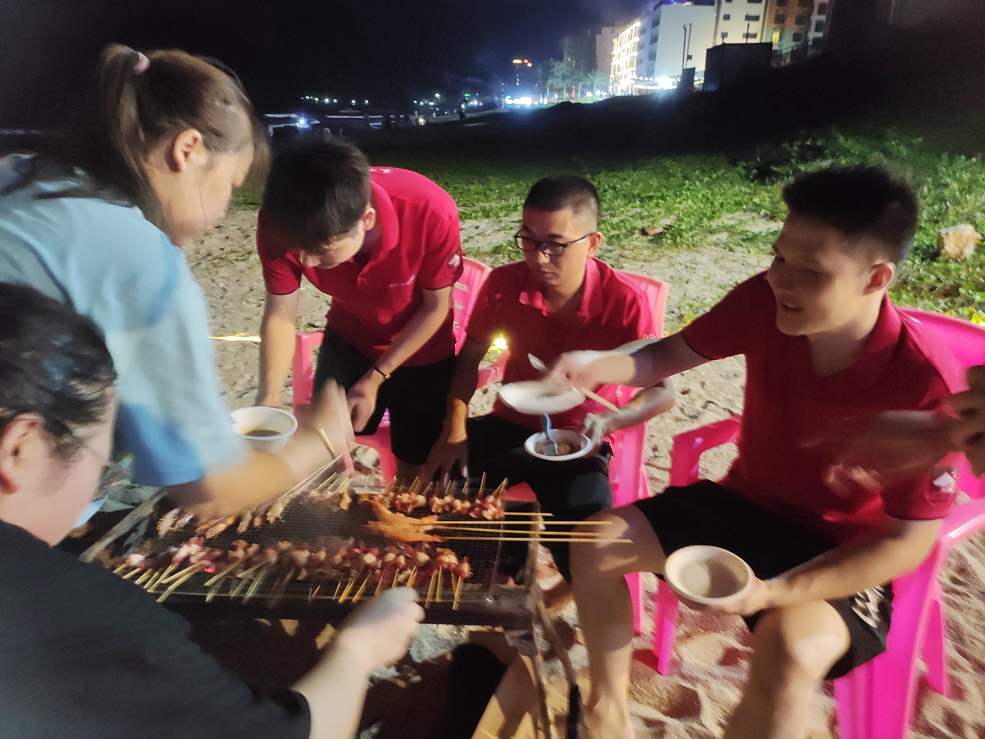 激動的戶外拓展過后,已經(jīng)是傍晚時(shí)分,是時(shí)候準(zhǔn)備一頓別樣的晚餐了。于是三五人洗菜切菜,八九人圍坐穿串,往日嚴(yán)肅少言的領(lǐng)導(dǎo),這一刻和大家一樣,都是穿串的“手工藝人”。