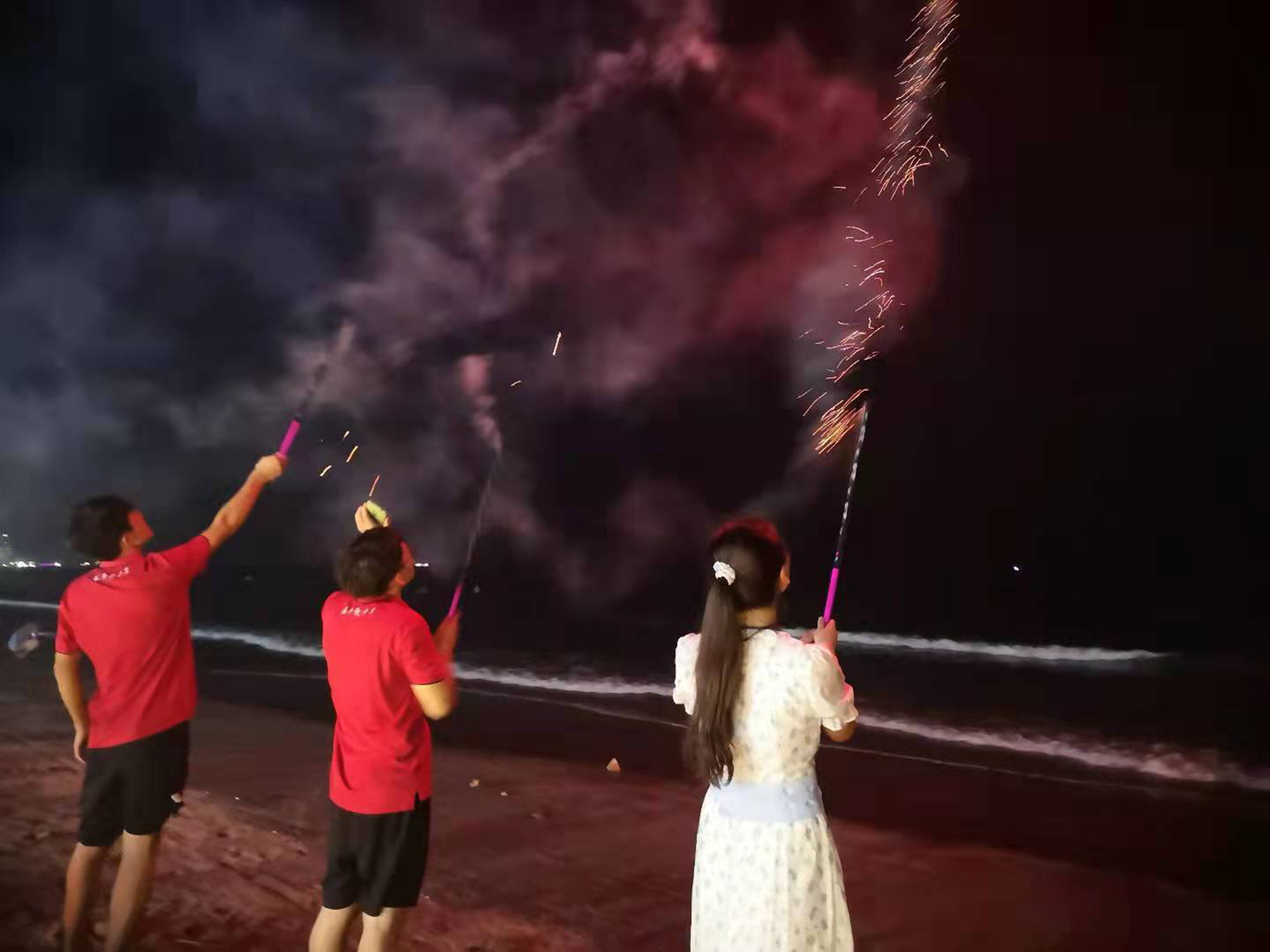 當(dāng)煙花的背景從疊疊幢幢的房子切換成無邊無際的黑夜和此起彼伏的浪濤,當(dāng)放煙花的人從形單影只到三五成群,所有的塵雜瑣事在那一刻都隨浪濤走遠(yuǎn)。而此刻與我們一起放煙花的人,一定也會與我們一起共同燦爛!