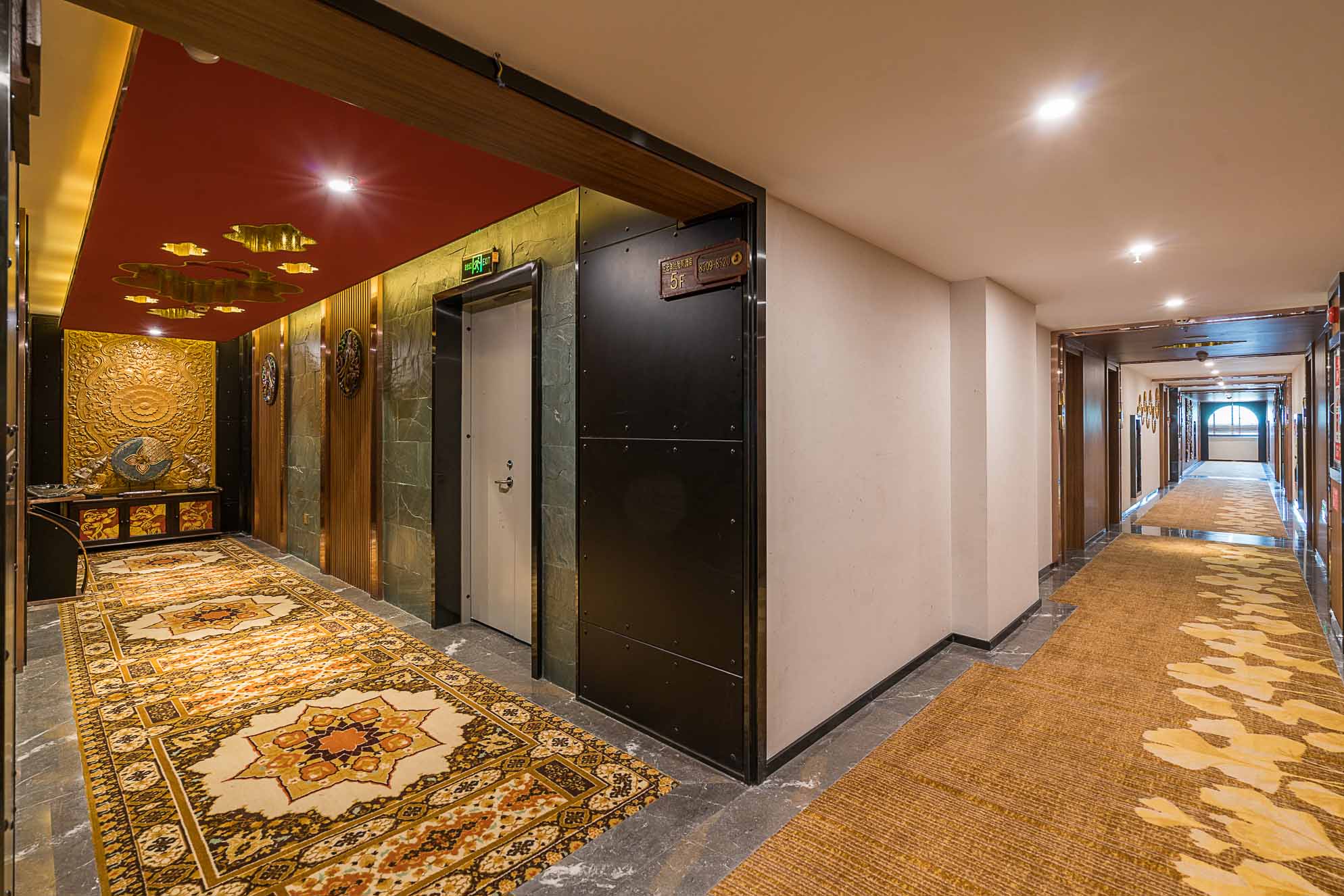 在電梯廳的設計上,紅色的天花、金色的墻體、金色的地毯,和整個酒店的泰式風格相輔相成,在邊幾上擺放富有泰式風情和佛教感覺的金色擺件,給人一種驚喜的感覺。