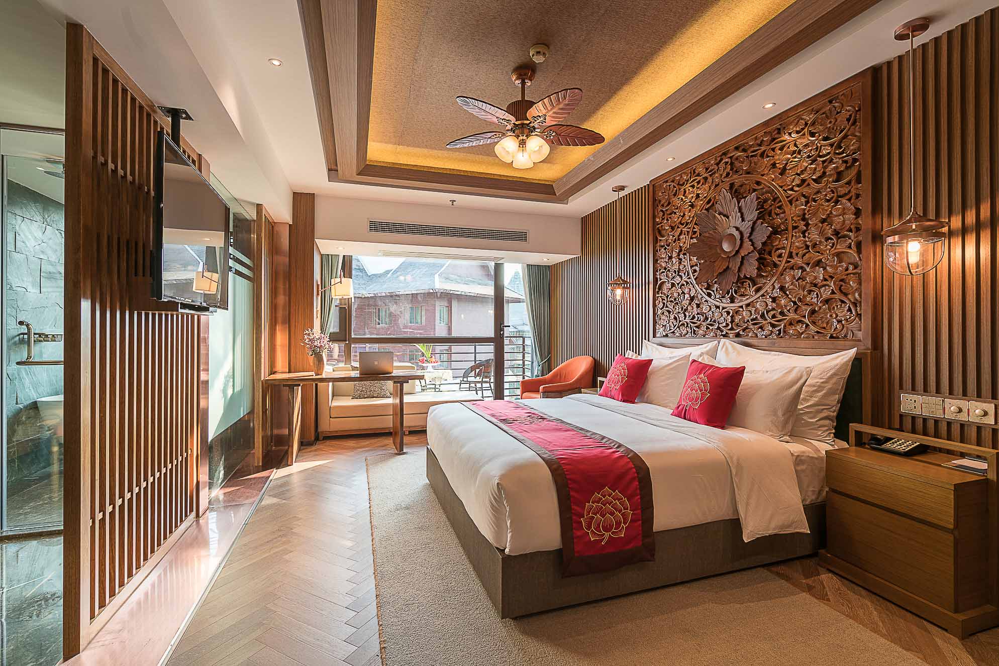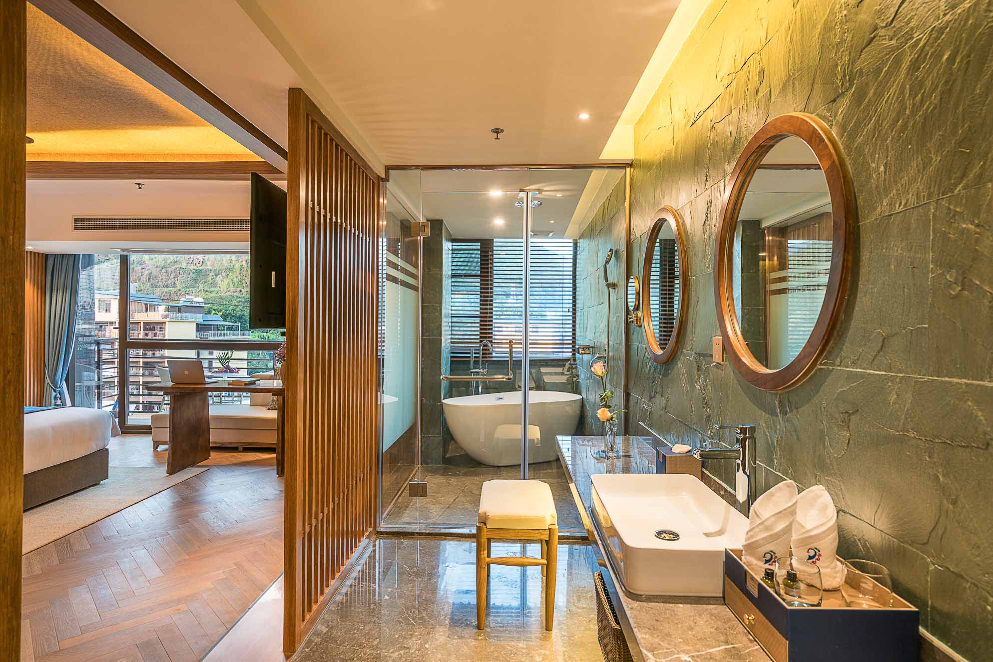 在客房的設計上,地板、沙發、茶幾、屏風、吊燈、臺燈、背景墻等都采用木材作為原材料,地毯則選用淺色系,給人回歸自然的寧靜感。