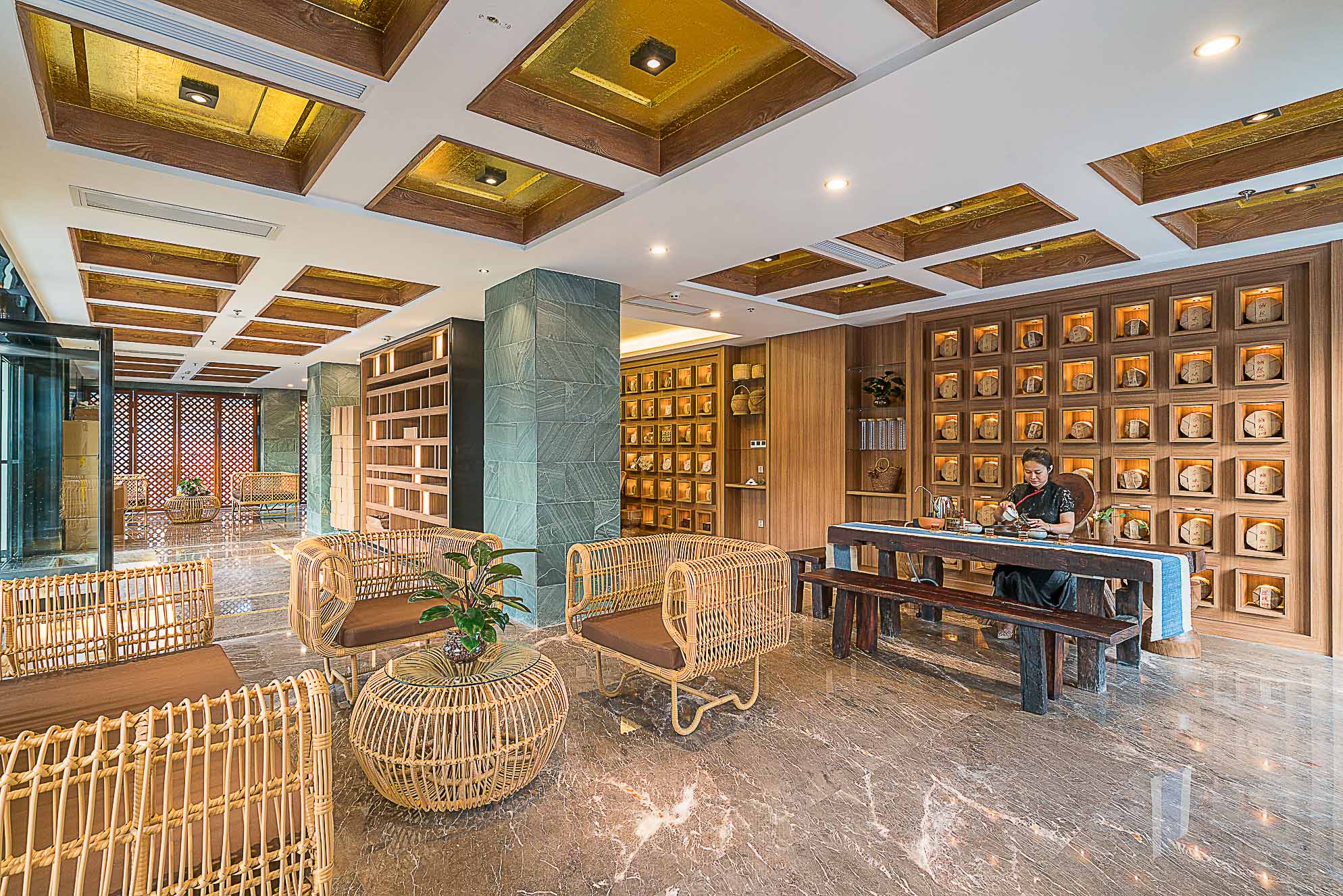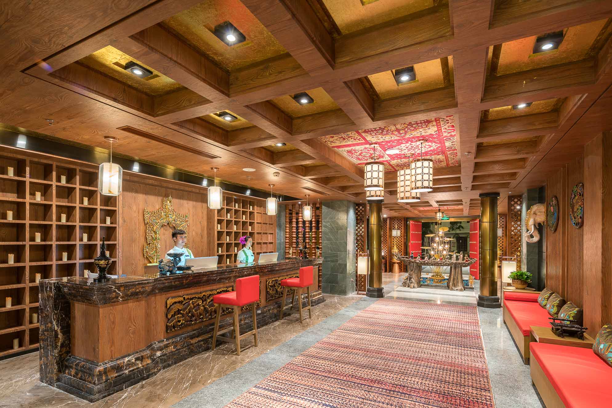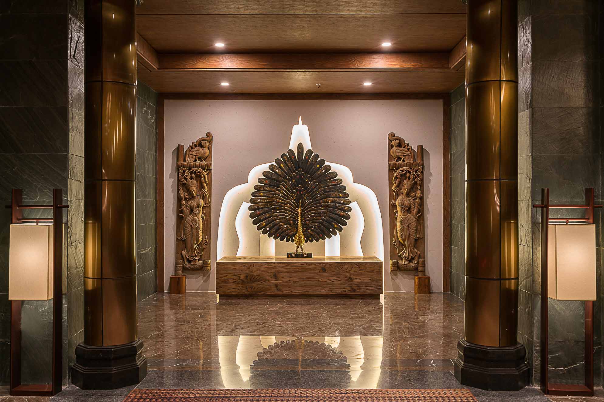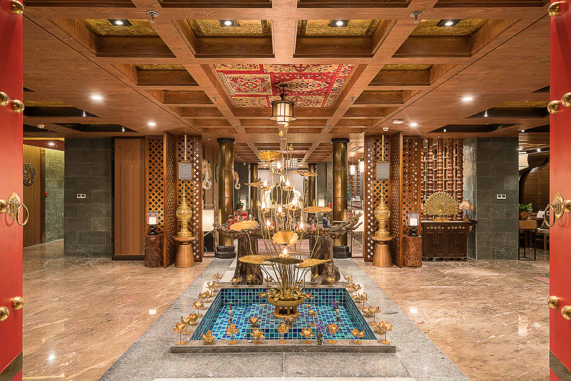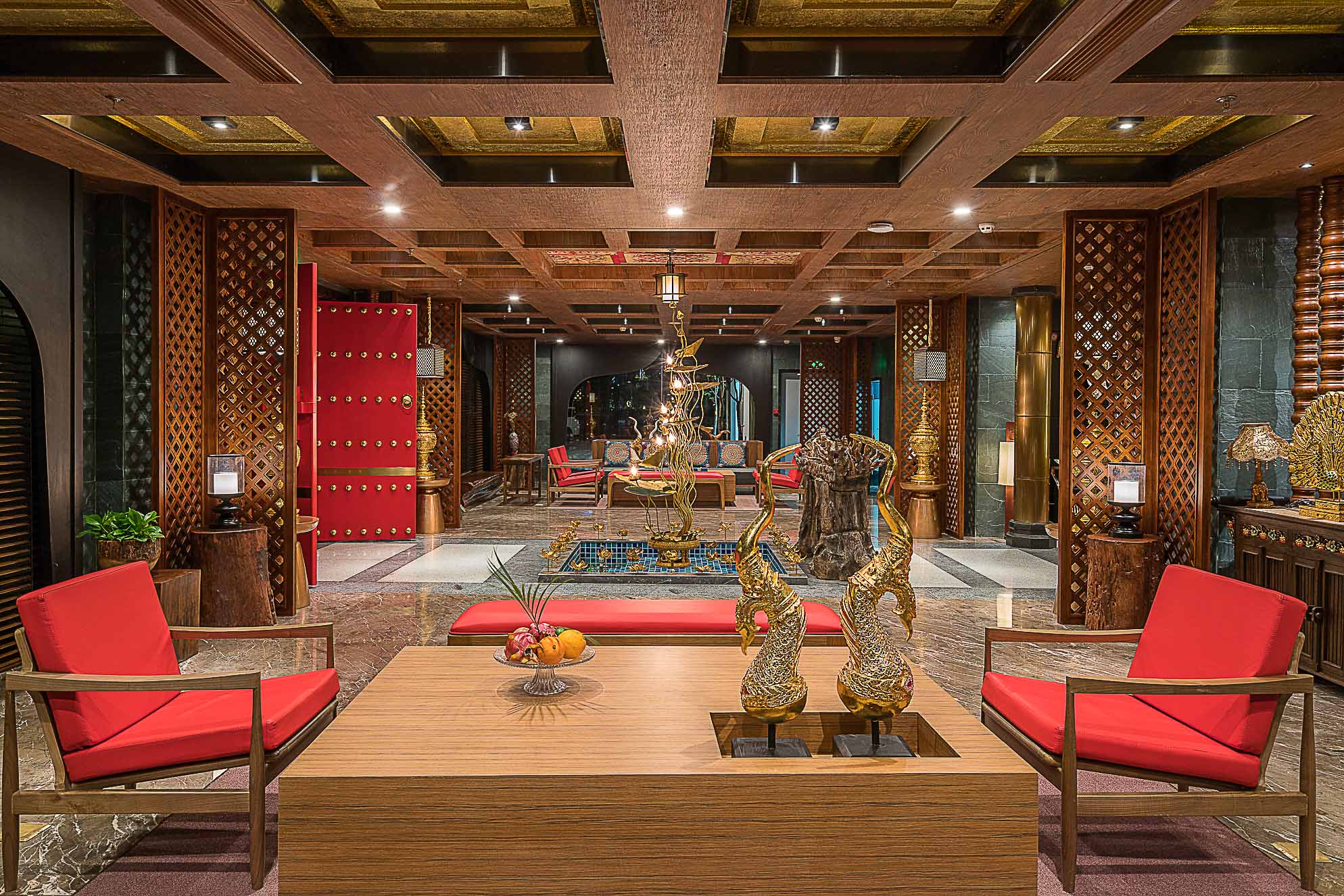 在大堂的設計上,整體以深褐色、金色、暗紅色為主,多選用實木材質和金色的金屬,整個空間既穩重,又能透出一種奢華之感。加上富有東南亞氣息的蓮花、孔雀及有佛教元素的擺件,使整個大堂也顯示出一種異域的神秘感。