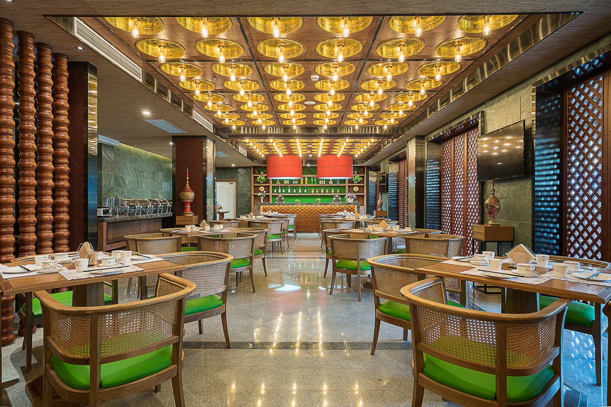 全日制餐廳,座椅選用泰式經典藤椅,和同色系的竹桌相結合,給人一種置身于林間木屋的感覺。天花吸頂燈采用金色燈罩,和大堂色彩搭配一致。餐廳兩側配有泰式陶瓷藝術擺件,在細致的地方體現泰式風格。餐具選用了簡潔古樸的白瓷,放在簡單的竹桌上,給人一種回歸自然、感受寧靜的感覺。