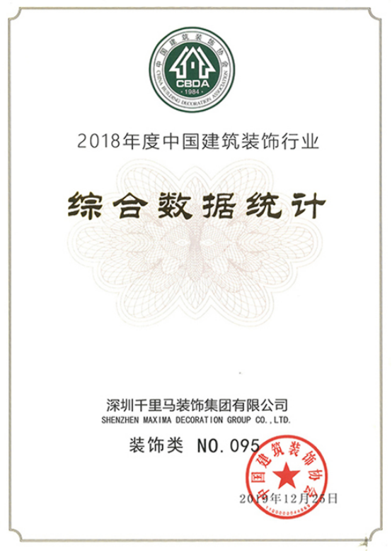 2019年12月24日,中國建筑裝飾協會揭曉了2018年度中國建筑裝飾行業數據綜合統計結果,深圳千里馬裝飾集團榮獲裝飾百強第95名。